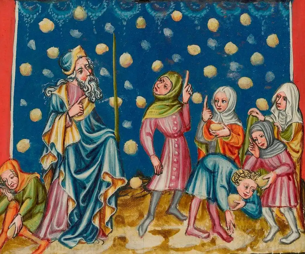 When the Israelites grumbled about their lack of food, God responded with incredible generosity and miraculous provision. He promised to “rain bread from heaven,” a miraculous bread called manna, which appeared each morning with the dew. This manna was a clear sign of God’s faithfulness, meeting their physical needs and encouraging continual trust in Him.
